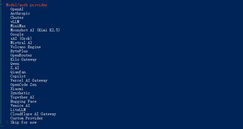 * Model/auth provider ,选择跳过 Skip for now