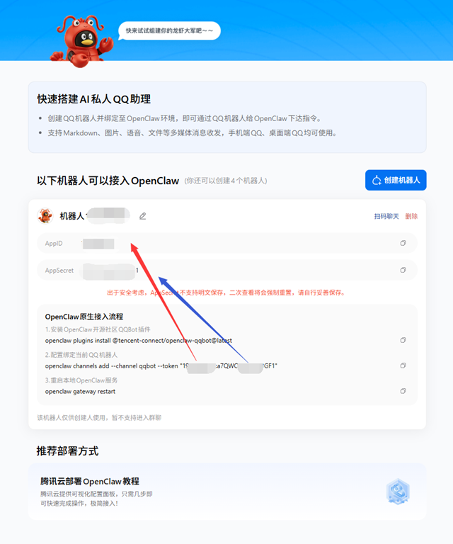 openclaw channels add --channel qqbot --token 这里是APPID:这里写Secreta